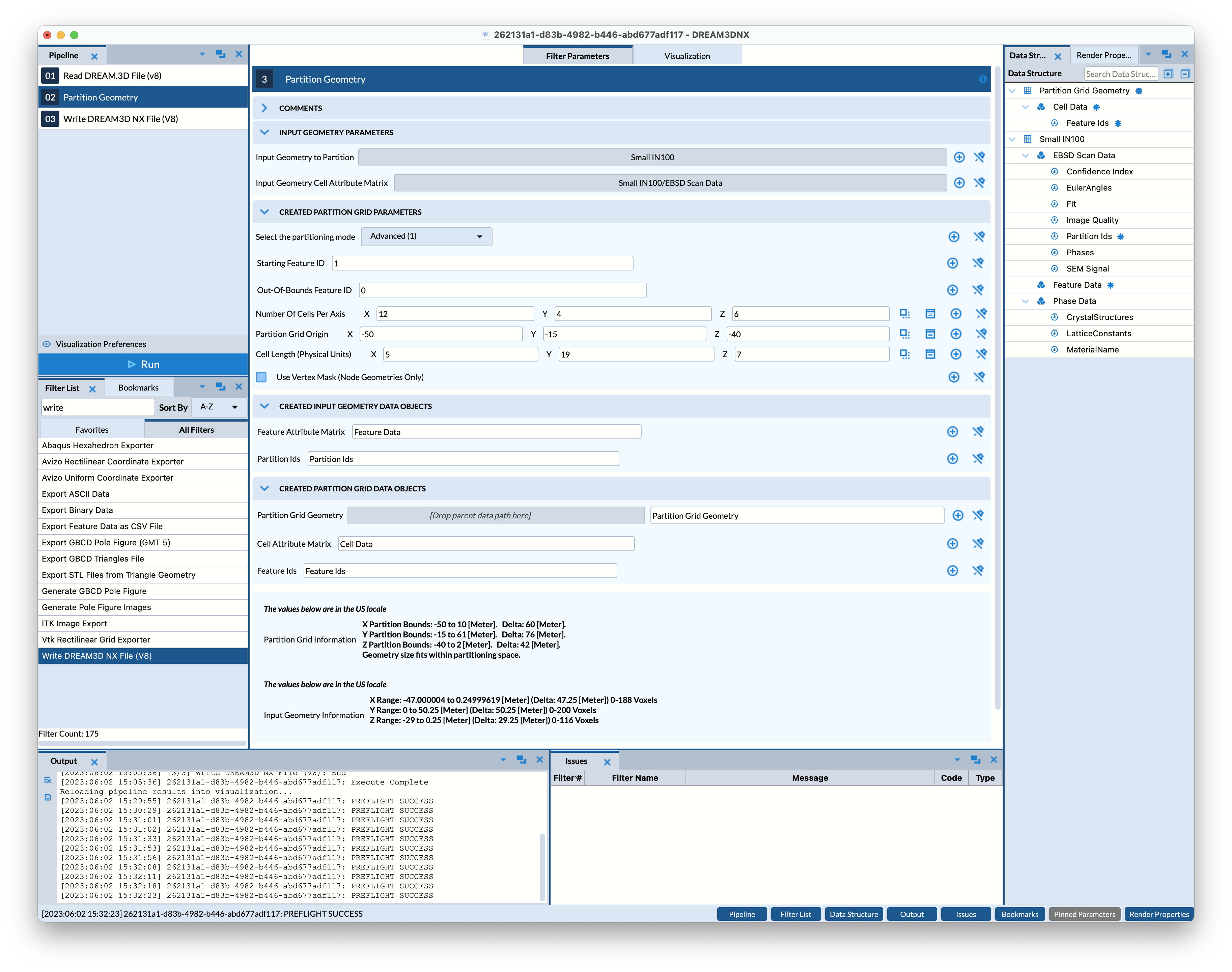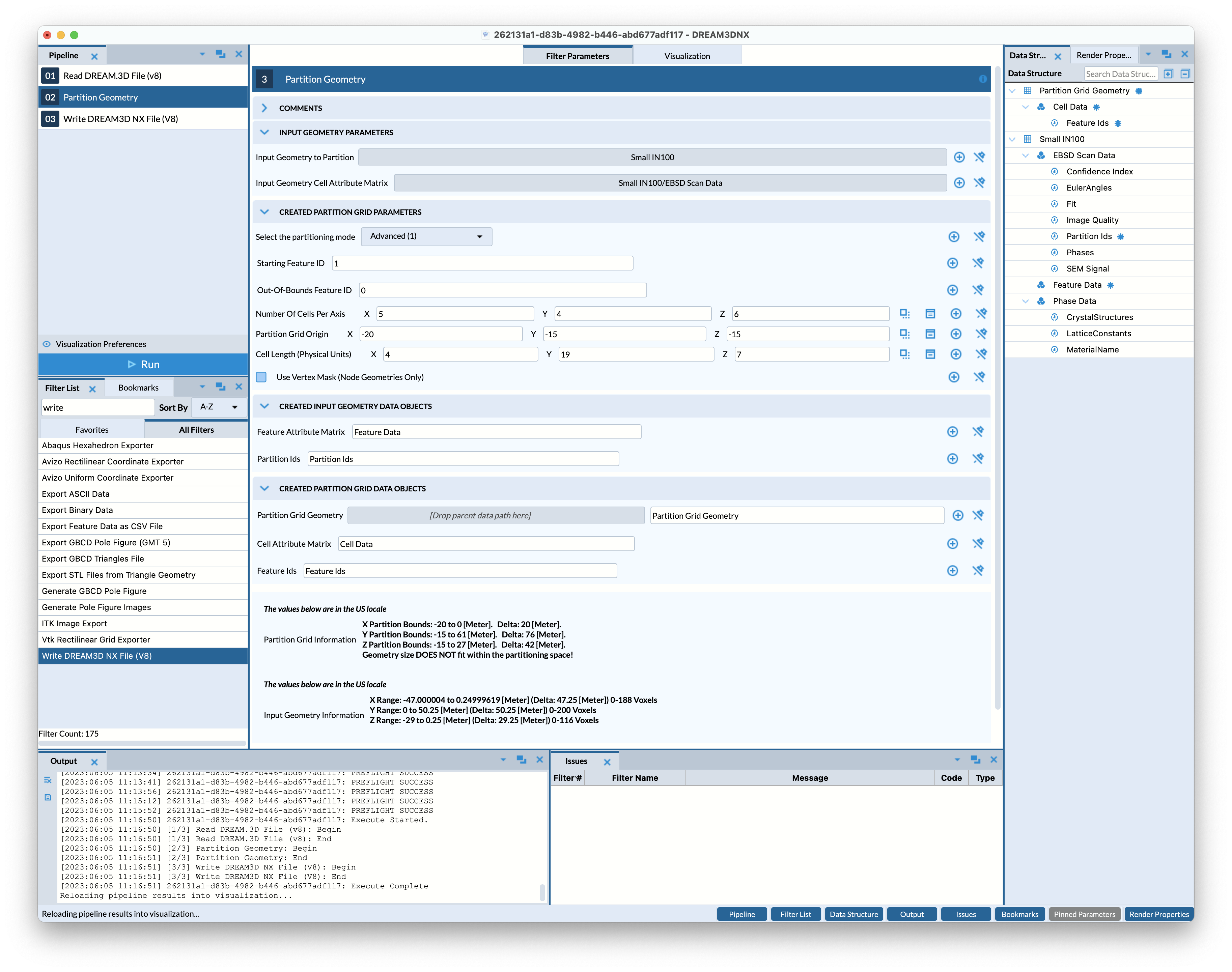 In Figure 1 above, the PartitionGeometry filter is using the SmallIN100 image geometry as an input geometry to generate a 5x5x5 partition grid with 125 features and the following outputs: