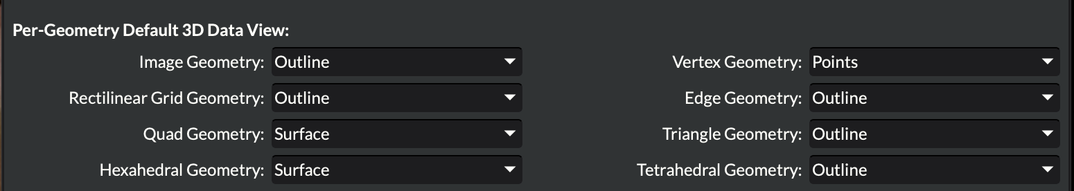 Changing the per-geometry defaults does not alter data views that are already present in the Visualization Pipeline Browser. Only newly imported data sources are affected.